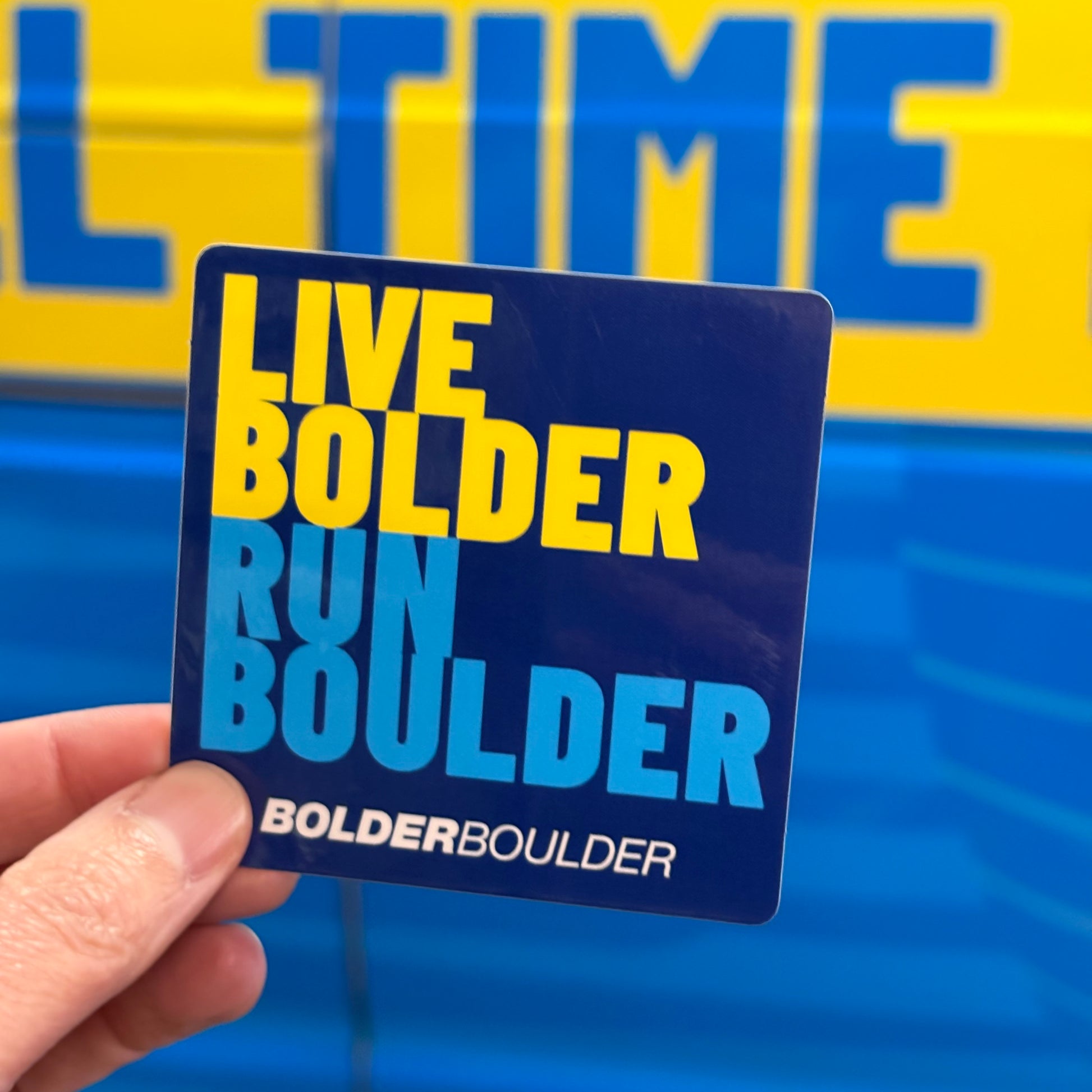 - 3-inch square sticker featuring our iconic Live BOLDER, Run Boulder saying.